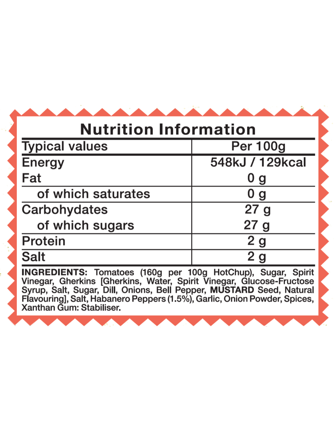 Tomates (160 g por 100 g de HotChup), azúcar, vinagre de alcohol, pepinillos [pepinillos, agua, vinagre de alcohol, jarabe de glucosa y fructosa, sal, azúcar, eneldo, cebolla, pimiento morrón, semilla de MOSTAZA, aroma natural], sal, chiles habaneros. (1,5%), Ajo, Cebolla en polvo, Especias, Goma Xantana: Estabilizante.